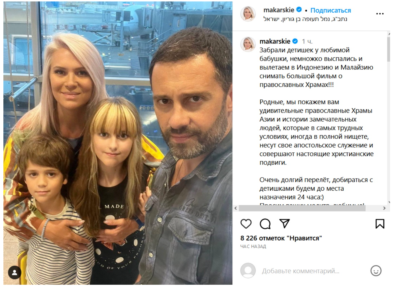 Перелет предстоит долгий, лететь нужно до нужного места сутки. Молитесь за нас, дорогие!” — попросили фанатов Макарские перед вылетом.