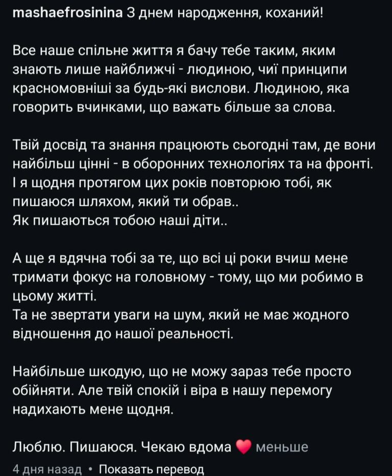 На фоне недавнего скандала, связанного с супругом Поляковой, Ефросинина опубликовала свежий снимок с партнером, которого называют “мажором” и который, по утверждению 62-летнего Вадима Буряковского, “ничего не делал сам, чтобы достичь успеха”. Под фото с мужем, отправившимся на фронт в начале спорных событий, она написала, что гордится.