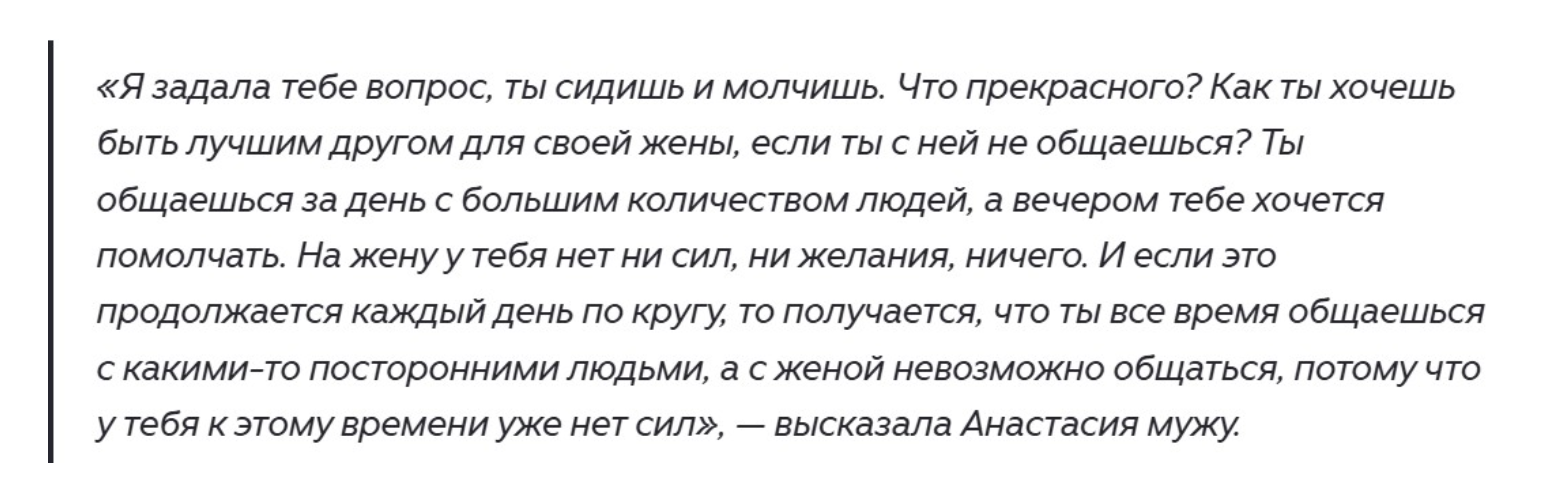 Теперь выяснилось, что и в отношениях с супругом не так все идеально. Он начал скрывать от нее свои разговоры. Анастасия не придумала ничего лучшего, как высказать свое недовольство на весь интернет. Она заявила мужу, что тот целый день непонятно с кем общается, а потом вечером не может поговорить с ней. Она что-то спрашивает, а он молчит. Сил у него больше нет на разговоры.