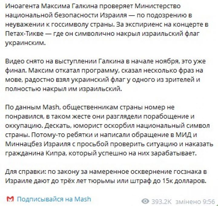 И власти Израиля не оставили без внимания кураж, или намеренное уничижение их флага на сцене. Галкина ждет официальная проверка и, как минимум, штраф, а как максимум – три года в израильской тюрьме.
