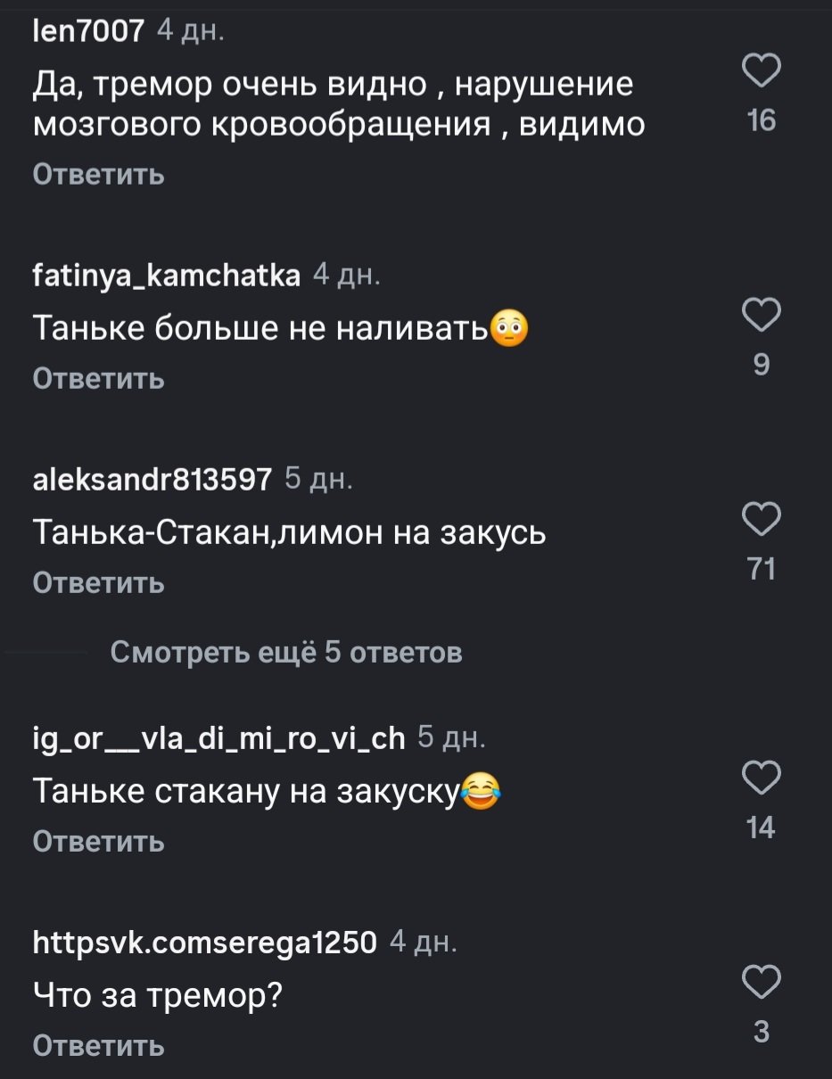 В комментариях пользователи выразили обеспокоенность по поводу ее состояния, указывая на явный тремор и обсуждая, что такого раньше не было.
