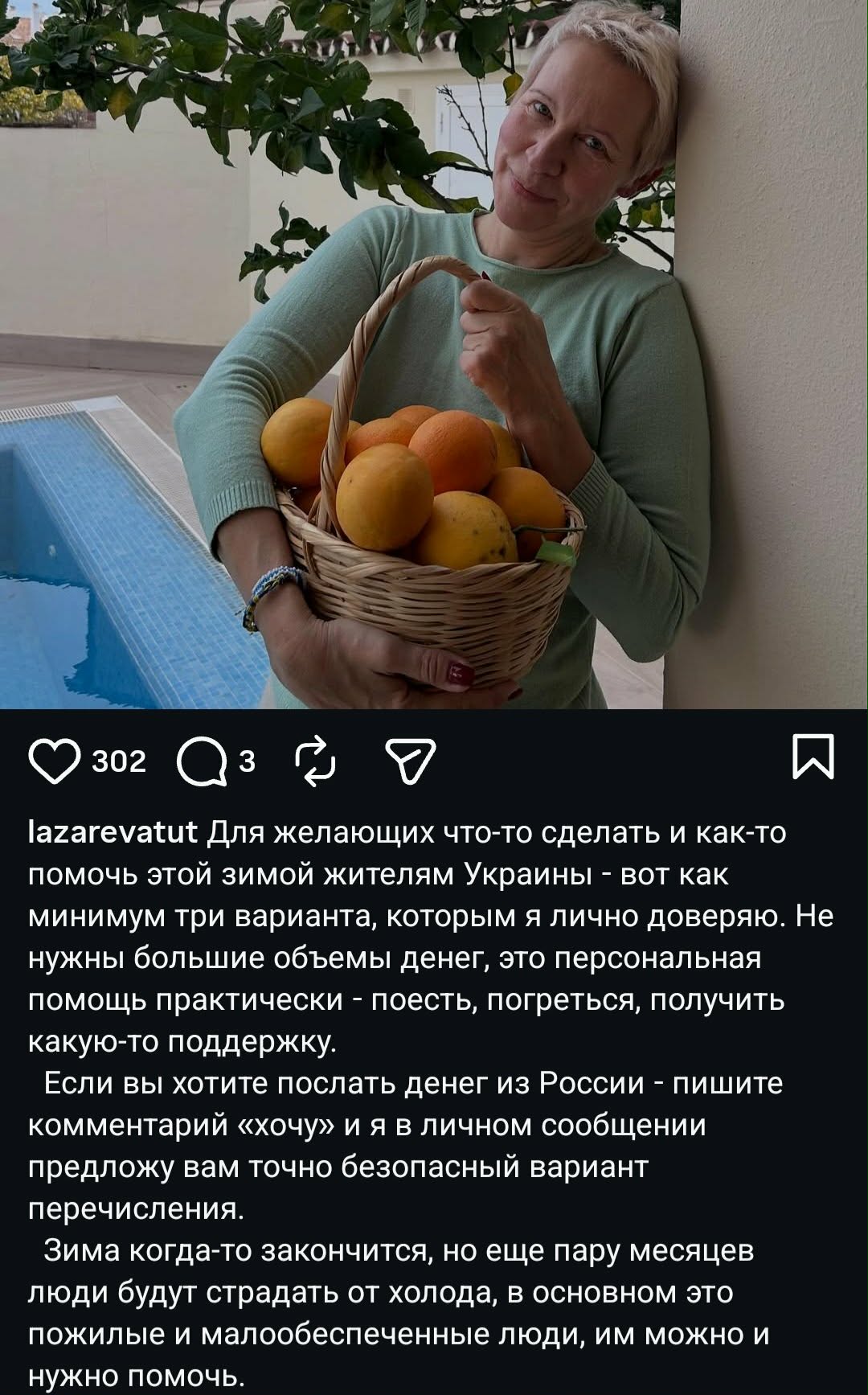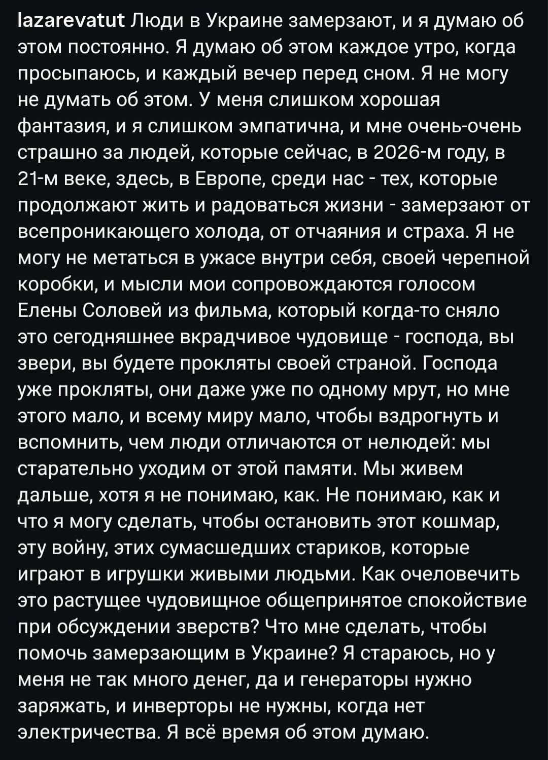 Татьяна Лазарева, осужденная заочно в России на семь лет, испытывает сильное беспокойство за людей, страдающих в Украине. Она отмечает, что каждый день, просыпаясь и ложась спать, она думает об этом. Актрису тревожит, что в XXI веке, в Европе, люди продолжают страдать от холода, отчаяния и страха.